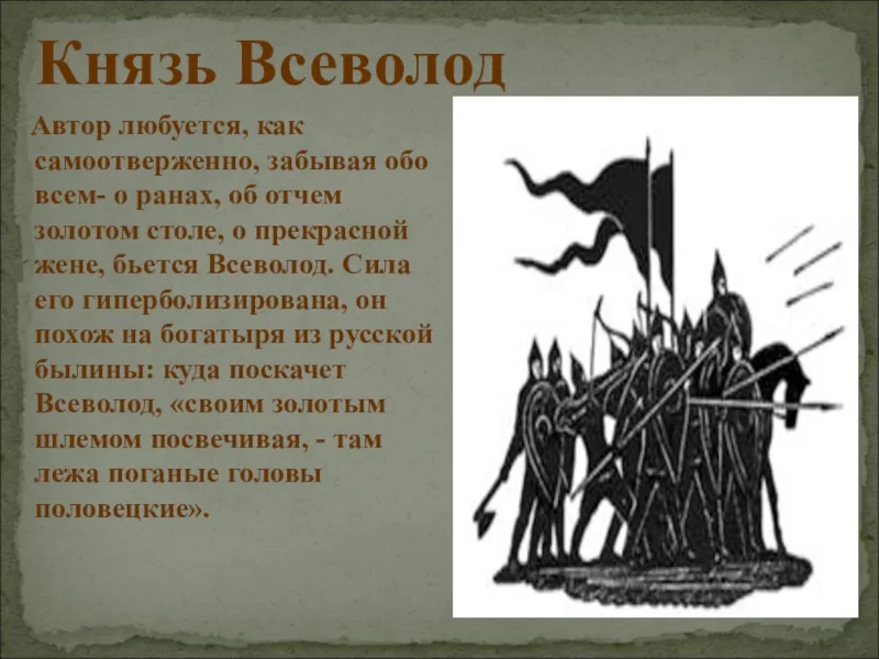 В тексте Всеволод представлен прежде всего как храбрый и опытный воин. Автор называет его «буй-туром», что является устойчивым поэтическим образом, обозначающим силу, отвагу и неукротимую воинскую энергию. Это сравнение подчёркивает физическую мощь Всеволода, его смелость и готовность к бою. Он не просто участник похода, а один из его главных военных опор.