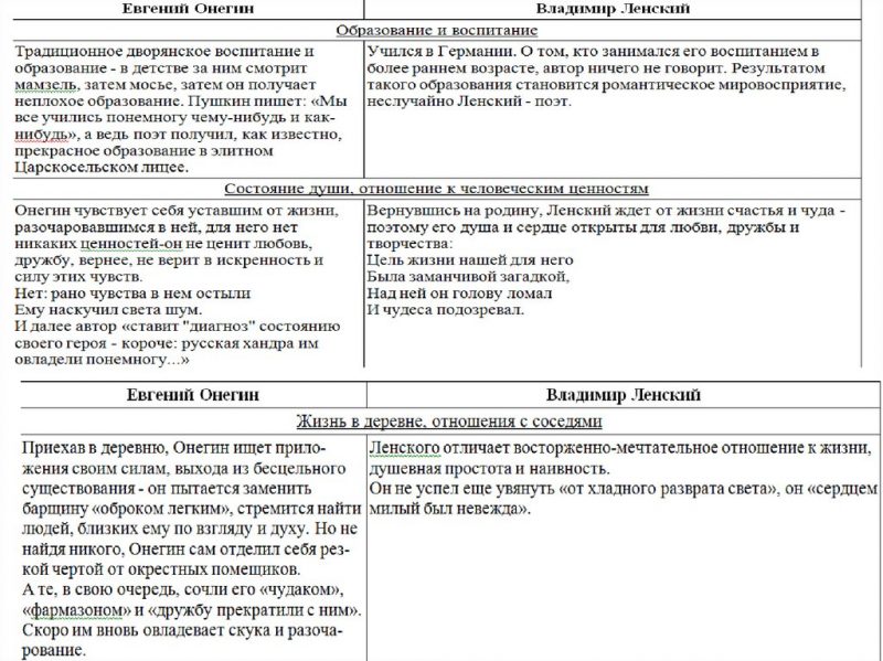 - Степень вовлечённости в жизнь. Ленский живёт эмоционально, активно, Онегин чаще наблюдатель, отчуждённый от мира.